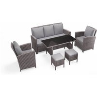 Salón de jardín El salón de jardín de ratán trenzado Modena en color gris claro te seducirá por sus líneas limpias que le permitirán adaptarse a cualquier exterior. Su mesa de vidrio templado negro le confiere un estilo elegante y de moda para la decoración de tu espacio de jardín, balcón o terraza. Este salón de gran versatilidad puede servirte tanto como salón de relajación como salón de comedor. Características técnicas Número de piezas: 6 Detalle de las piezas: 1 mesa, 1 sofá, 2 sillones, 2 puff Tipo de salón de jardín: Comedor Color: Gris claro Forma de la mesa: Rectangular Material de la estructura: Acero Material de la mesa: Ratán trenzado Vidrio en la mesa: Sí Tipo de vidrio: Vidrio templado negro Con cojín: Sí Número de cojines: 10 Color de los cojines: Gris Respaldo desmontable: Sí Asiento desmontable: Sí Con cremallera: Sí Tipo de espuma de los cojines: Algodón PP Densidad de la espuma: 900g Peso máximo soportado por la mesa: 80 kg Peso máximo soportado por el sofá: 320 kg