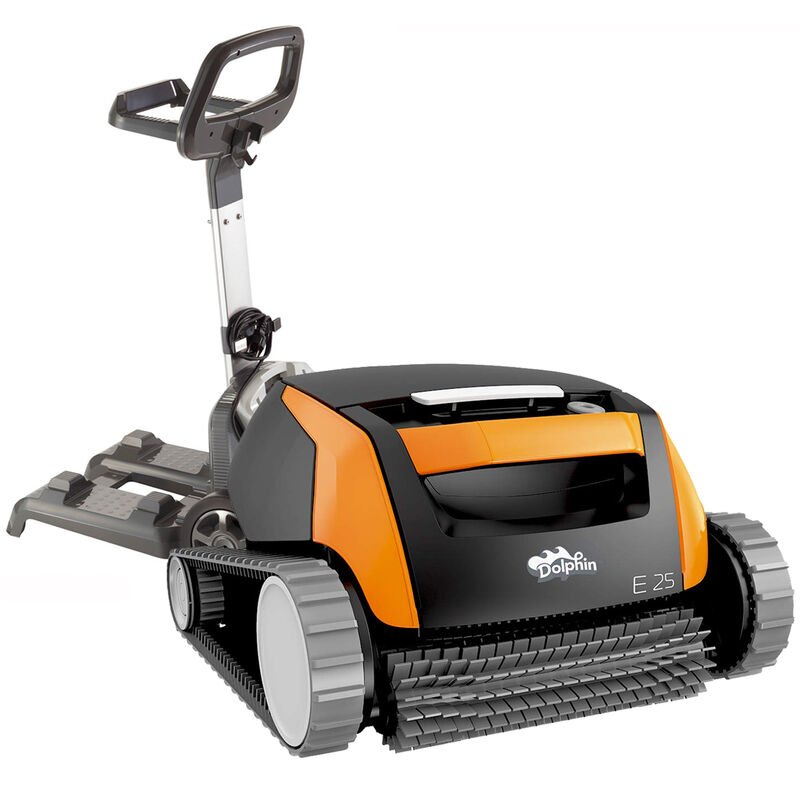 Piscina robotizada eléctrica fondo y paredes programable dolphin E25 El Dolphin E25 es un robot para piscinas con una óptima relación calidad / precio. Este limpiafondos ligero es ideal para limpiar el fondo y las paredes de piscinas pequeñas (máximo 10 m de largo), incluidas las piscinas elevadas. Deshazte de las tareas de limpieza, recogiendo hojas y suciedad del fondo de la piscina: el robot de piscina Dolphin E25 se encarga de ello por ti. Limpiando y eliminando algas e impurezas, el robot de piscina Dolphin E25 deja un agua cristalina y clara, lista para usar en todas las circunstancias. Equipado con un programador semanal que permite que este robot arranque a una hora fija ya sea todos los días, 2 días o 3 días y esto durante una semana para un ciclo de 2 horas de duración. El drenaje de agua rápido y limpio le permitirá sacar su robot Dolphin E25 de la piscina sin esfuerzo. Sistema de navegación Clever-Clean: calcula la longitud y el ancho de la piscina para una cobertura
