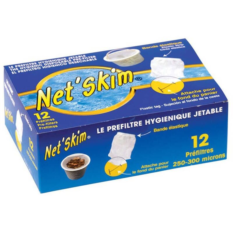 Mejora la calidad del agua. Mantenimiento más fácil y menos frecuente de la piscina. Preservación de la bomba y de todo el material. Net Skim Fácil de colocar. Doble fijación por banda elástica y enganche en el fondo del cesto (p/ todos los cestos hasta un diámetro de 24 cm). Cada caja contiene 12 prefiltros. Válido para spas y para piscinas.