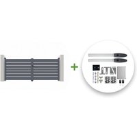 La puerta batiente EIGER con su diseño sencillo y moderno permite una ocultación total para una mayor privacidad. Descripción : Puerta abatible recta de ocultación recta, 2 hojas Material : Aluminio Color : Gris antracita (RAL 7016) Dimensiones : Ancho 350 cm x Alto 145 cm Ancho requerido entre pilares : 355 cm Altura mínima del pilar: 160 cm Inspirado y diseñado en Francia Este kit de puerta batiente para montar e instalar por ti mismo contiene : – 14 lamas con recubrimiento en polvo (Altura 16 cm) – 2 lamas con recubrimiento en polvo reforzado para la motorización (Altura 16 cm) – 2 bisagras superiores – 2 bisagras inferiores – 1 tope central – 2 topes final de carrera – 1 cerradura de cilindro – 1 manilla (Color Negro) – 5 Llaves – Tapas de acabado – Tornillos y pernos Los postes no están incluidos en nuestros kits porque no son esenciales para la instalación de su puerta batiente en caso de que su exterior ya tenga pilares / postes. La altura mínima de los pilares para esta puerta