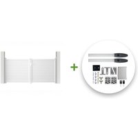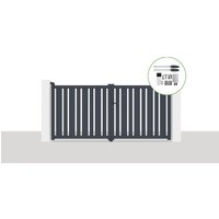 La puerta batiente VOGEL con su diseño sencillo y moderno es ideal para áreas expuestas al viento. Descripción : Puerta abatible recta con separaciones entre lamas, 2 hojas Material : Aluminio Color : Gris antracita (RAL 7016) Dimensiones : Ancho 300 cm x Alto 143 cm Ancho requerido entre pilares : 305 cm Altura mínima del pilar: 160 cm Inspirado y diseñado en Francia Este kit de puerta batiente para montar e instalar por ti mismo contiene : – 12 lamas con recubrimiento en polvo (Altura 15.5 cm) – 2 lamas con recubrimiento en polvo reforzado para la motorización (Altura 15.5 cm) – 2 bisagras superiores – 2 bisagras inferiores – 1 tope central – 2 topes final de carrera – 1 cerradura de cilindro – 1 manilla (Color Negro) – 5 Llaves – Tapas de acabado – Tornillos y pernos Los postes no están incluidos en nuestros kits porque no son esenciales para la instalación de su puerta batiente en caso de que su exterior ya tenga pilares / postes. La altura mínima de los pilares para esta puerta