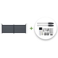 La puerta batiente VOGEL con su diseño sencillo y moderno es ideal para áreas expuestas al viento. Descripción : Puerta abatible recta con separaciones entre lamas, 2 hojas Material : Aluminio Color : Gris antracita (RAL 7016) Dimensiones : Ancho 350 cm x Alto 143 cm Ancho requerido entre pilares : 355 cm Altura mínima del pilar: 160 cm Inspirado y diseñado en Francia Este kit de puerta batiente para montar e instalar por ti mismo contiene : – 12 lamas con recubrimiento en polvo (Altura 15.5 cm) – 2 lamas con recubrimiento en polvo reforzado para la motorización (Altura 15.5 cm) – 2 bisagras superiores – 2 bisagras inferiores – 1 tope central – 2 topes final de carrera – 1 cerradura de cilindro – 1 manilla (Color Negro) – 5 Llaves – Tapas de acabado – Tornillos y pernos Los postes no están incluidos en nuestros kits porque no son esenciales para la instalación de su puerta batiente en caso de que su exterior ya tenga pilares / postes. La altura mínima de los pilares para esta puerta