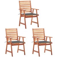 Este moderno juego de sillas de comedor de madera con cojines dará un toque de estilo natural a tu jardín, terraza o patio. Este juego de sillas de madera será una gran opción para cenar al aire libre. Estas sillas de jardín están hechas de madera maciza de acacia, una madera dura tropical, que es resistente a la intemperie y duradera para años de uso. La superficie con acabado de aceite es fácil de limpiar con un paño húmedo. El diseño de listones aportará un encanto rústico. Además, los cojines incluidos brindan mayor comodidad al sentarse. Está confeccionado en 100% poliéster que ha sido tratado para hacerlo impermeable. Cada cojín tiene dos juegos de cuerdas para fijarlo firmemente a la silla. Color de cojín: Beige Material de la silla: Madera maciza de acacia Material del cojín: Tela (100% poliéster) Dimensiones de la silla: 56 x 62 x 92 cm (ancho x profundo x alto) Dimensiones del cojín: 50 x 50 x 3 cm (largo x ancho x alto) Anchura del asiento: 47 cm Altura del asiento desde el